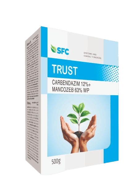 SFC Trust, a broad-spectrum systemic and contact fungicide. It is a wettable powder (WP) formulation containing Carbendazim 12% + Mancozeb 63% WP.
